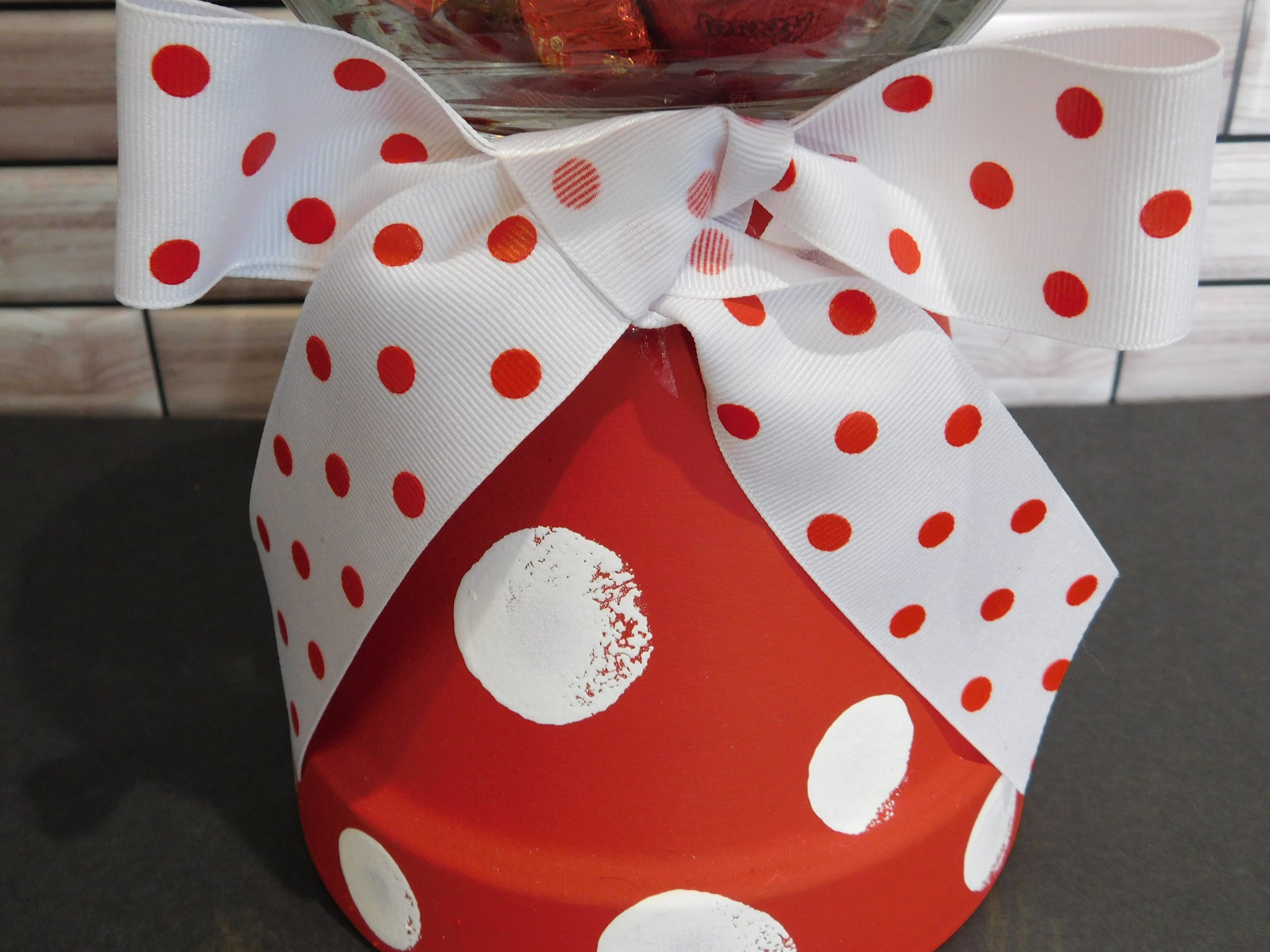 Painted with a combination of acrylic and chalk based paint and accented with a white and red polka dot ribbon.